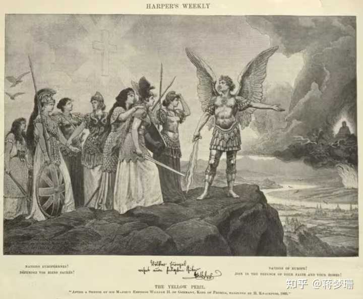 1895年,德皇威廉二世正式提出了“黄祸论”(Die Gelbe Gefahr)。并在同年夏天由威廉二世本人亲自绘制了一幅草图,并将其交给卡塞尔美术学院的德国画家赫曼·科纳科夫斯(Hermann Knackfus)完成,最终形成了这幅著名的,在欧美被广为宣传的《黄祸图》。