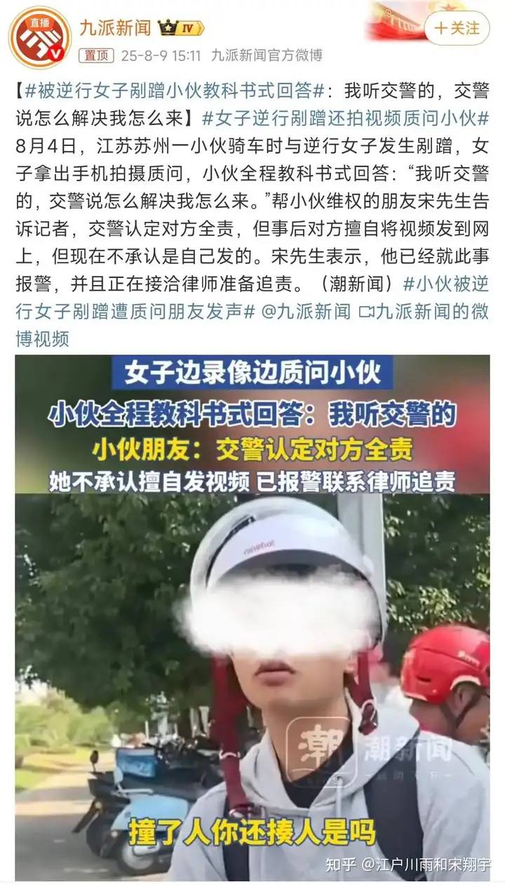 不过,很多人其实很难像这个小伙子那样,做到不接招,不纠缠,不自证的。你看那个逆行的女的,她不停的在撒谎无中生有污蔑小伙子打人,甚至对小伙子进行人身攻击,甚至抛开事实不谈就想让小伙子对她说句对不起,这其实和武汉大学杨同学的录音里的套路简直一模一样!她就是想刺激小伙子,试图诱导小伙子去自证清白的说出那些反驳她的话,甚至是愤怒的脏话,哪怕是一个对不起都行,因为这样她在剪辑小作文的时候这都是她诱导舆论的核武器。