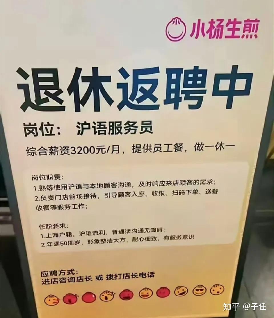 最近上海一家连锁生煎店火了,不是因为馅料有多鲜、皮子有多脆,而是因为招聘启事:月薪3200,做一休一,必须是退休人员,年满50岁,会讲上海话,外地人免谈。