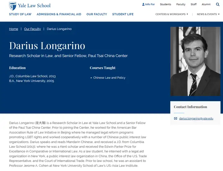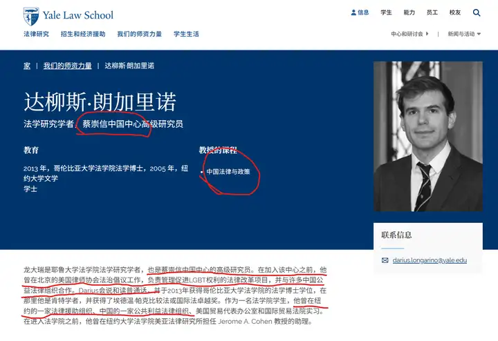 注意关键词:龙大瑞是耶鲁大学法学院法学研究学者,也是蔡中曾中国中心(机翻为蔡崇信,但是考证应该为蔡中曾)的高级研究员。在加入该中心之前,他曾在北京的美国律师协会法治倡议工作,负责管理促进LGBT权利的法律改革项目,并与许多中国公益法律组织合作。Darius会说和读普通话,并于2013年获得哥伦比亚大学法学院的法学博士学位,在那里他是肯特学者,并获得了埃德温·帕克比较法或国际法卓越奖。作为一名法学院学生,他曾在纽约的一家法律援助组织、中国的一家公共利益法律组织、美国贸易代表办公室和国际贸易法院实习。在进入法学院之前,他曾在纽约大学法学院美亚法律研究所担任 Jerome A. Cohen 教授的助理