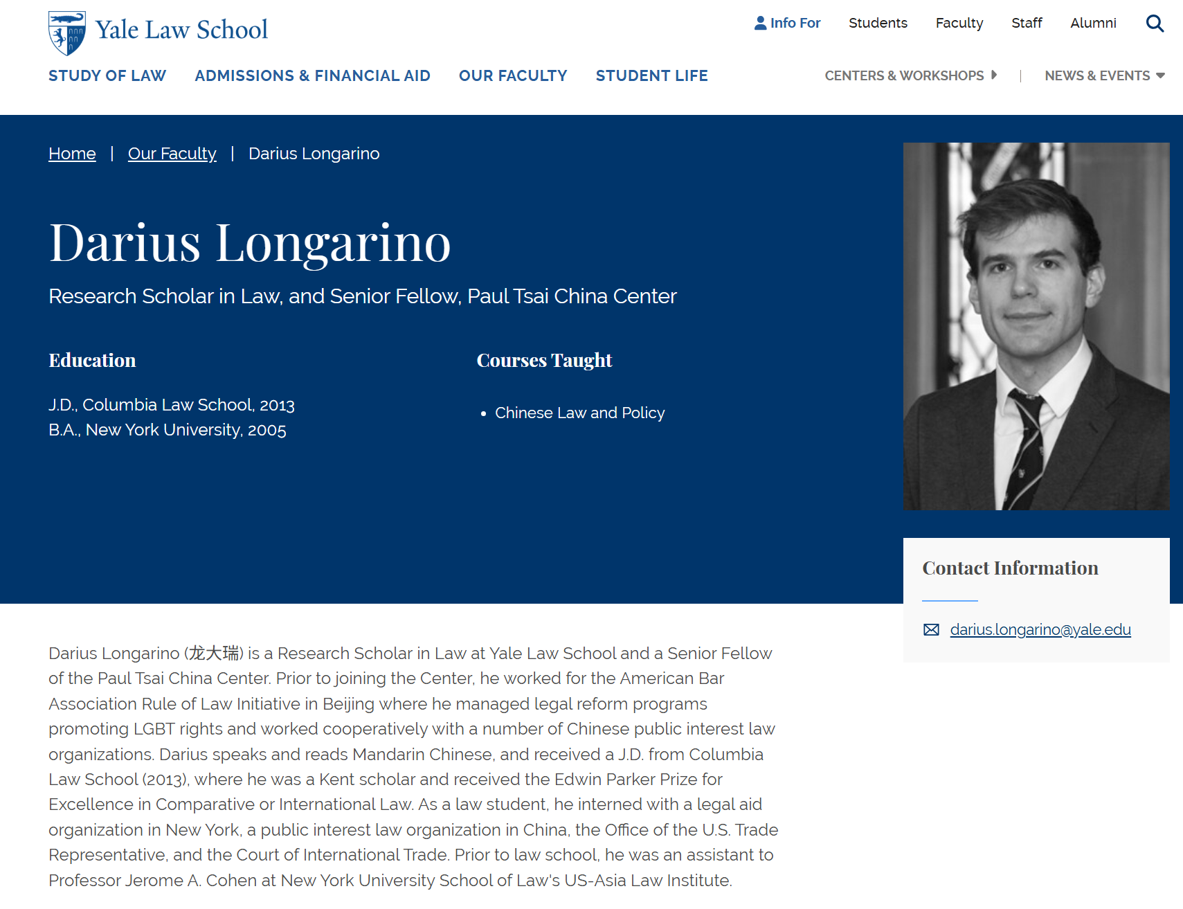 注意关键词:龙大瑞是耶鲁大学法学院法学研究学者,也是蔡中曾中国中心(机翻为蔡崇信,但是考证应该为蔡中曾)的高级研究员。在加入该中心之前,他曾在北京的美国律师协会法治倡议工作,负责管理促进LGBT权利的法律改革项目,并与许多中国公益法律组织合作。Darius会说和读普通话,并于2013年获得哥伦比亚大学法学院的法学博士学位,在那里他是肯特学者,并获得了埃德温·帕克比较法或国际法卓越奖。作为一名法学院学生,他曾在纽约的一家法律援助组织、中国的一家公共利益法律组织、美国贸易代表办公室和国际贸易法院实习。在进入法学院之前,他曾在纽约大学法学院美亚法律研究所担任 Jerome A. Cohen 教授的助理