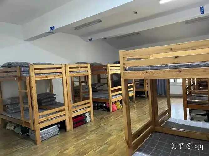 客观来说,东方绿舟基地的生活条件很差。学生住宿的场所称为“公寓”,每座公寓都会以不同国家的名字作为前缀,譬如“西班牙公寓”。公寓通常为两层,每层由几间寝室构成,每间寝室至少是四人寝,最多的据说达到二十八人寝,笔者当年军训时住的是十二人寝。寝室的床铺是架子床,分上下铺,由木质材料搭建而成(见下图)。寝室的总体环境较差,蚊虫较多,隔音效果差,床板较硬。