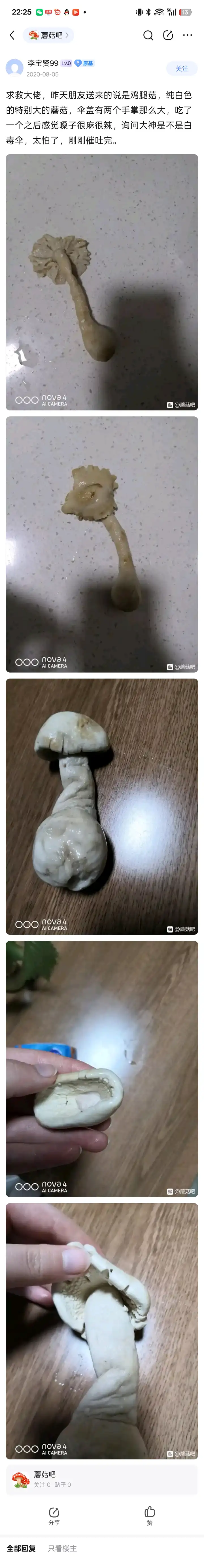 有一个人——也不知道到底是哥们儿还是姐们儿,但看他的ID我觉得是哥们儿的可能性更大——声称昨天朋友给他送来一些“鸡腿菇”,他吃过一个以后觉得嗓子很麻很辣,怀疑吃到了毒蘑菇,于是做了催吐,然后给吐出来的蘑菇拍了几张照片,求助于万能的吧友,询问到底是不是有毒,应该怎样处理。结果蘑菇吧的大佬们一看:卧槽这不鹅膏菇吗?剧毒。吃完之后必须马上洗胃才有一丢丢救回来的希望,否则必死。如果这哥们儿真像他说的那样已经吃过一天了,而且仅仅做了催吐,那这个时候已经可以提些料理后事了。