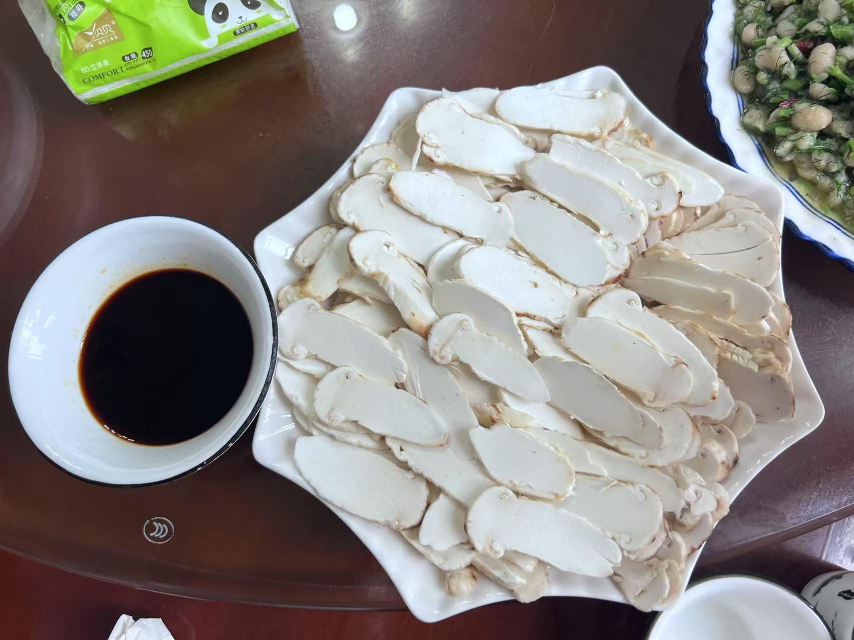这是自己弄的松茸刺身,人间绝味,做法简单,松茸清理干净后,切片,配上酱油芥末即可。一口咬下去,鲜舔的汁水就涌入了你的味蕾。同时,松茸再炖只土鸡喝汤。刺身没有吃完的用黄油煎一下,又是另外一种风味。