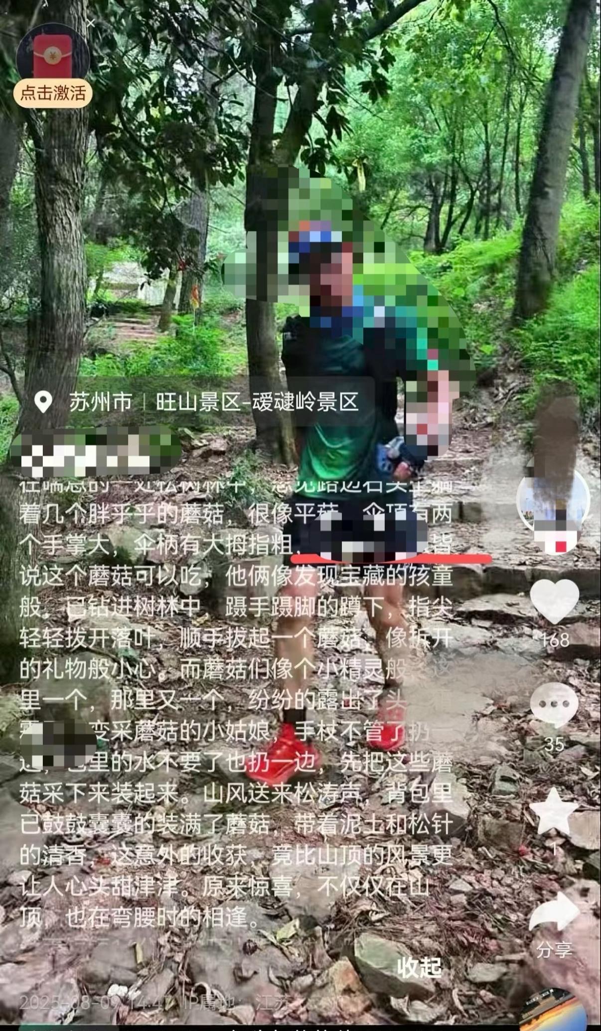 苏州一个越野跑大神(ID爱抚人生),8月9日发布视频显示,他们在苏州旺山越野跑时发现了很多野生蘑菇,非常高兴的采蘑菇