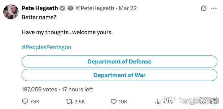 几个月前,美国防长赫格塞思在社交媒体上搞了个民意调查,问大家支不支持把“国防部”改回“战争部”。结果,将近20万人参与投票,居然有54%的人投了赞成票。现在,川普也提议要将美国“国防部”改名为“战争部”。
