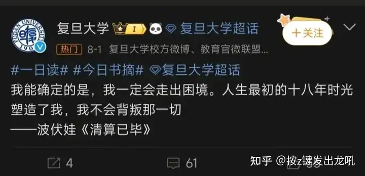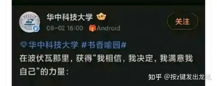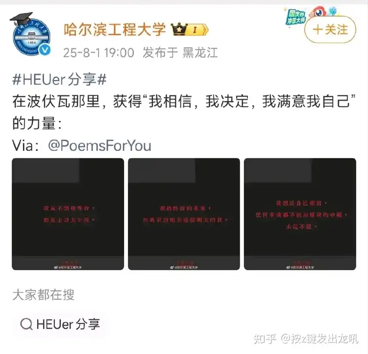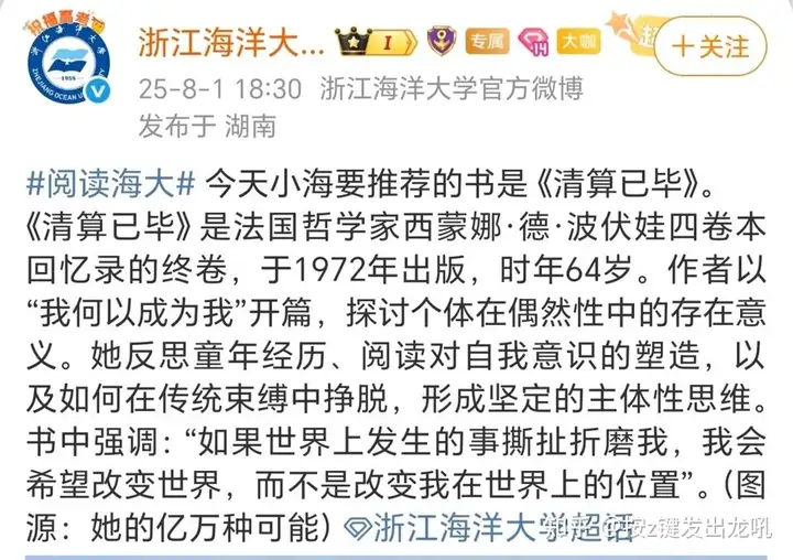 12、2025/8/1 复旦大学、华中科技大学、哈尔滨工程大学、浙江海洋大学官方微博转发波伏娃语录,然后网友想起2025/7/25武汉大学官方微博发布的波伏娃语录及2025/7/27武汉大学官方微博发布的冻肉动态,认为武汉大学官方微博在阴阳、而这些高校微博在响应狗哨。 网友怒气值+1,通过各种手段反馈舆情到相应高校,随后一天内,华中科技大学、哈尔滨工程大学、浙江海洋大学都删除了对应微博。
