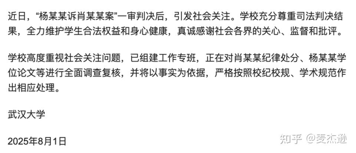 10、2025/8/1 武汉大学发布通报,称关注到了杨某某诉肖某某案,并将做出相应处理,之后一直装死。