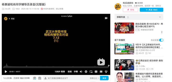 8、2025/7/29 抖音博主“李然于心”由于发布质疑杨景媛学术不端的视频,当晚被二级警督陪同的粉衣男子家访,要求下架视频、平息舆论,家访视频流出后,舆论进一步炸锅,网友怒气值+1,同时发现扒学术成果真的有用。