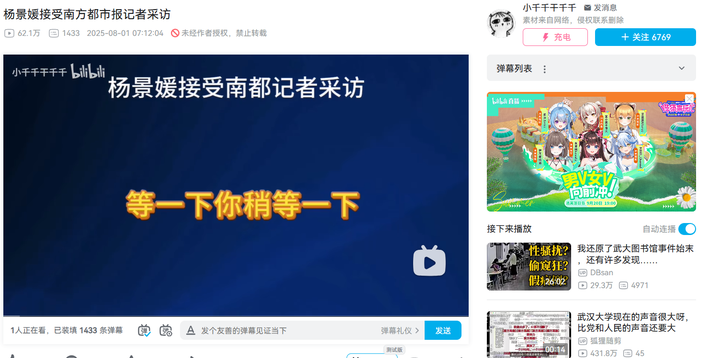 11、2025/8/1 经杨景媛剪辑后发布的接受南方都市报女记者采访录音文件在网上热烈传播,采访中杨景媛破防失态,发布后本以为网友会为她站队却适得其反,网友怒气值+1。