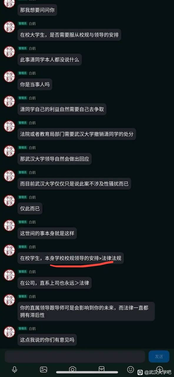 14、2025/8/10 武大25级新生群管理员白鹤发表逆天言论:学校领导的安排 > 法律法规,网友怒气值+1。