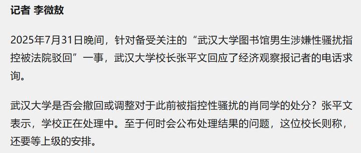 9、2025/7/31 武汉大学校长张平文回应经济观察报记者的电话求询,表示还要等上级的安排,网友怒气值+1。