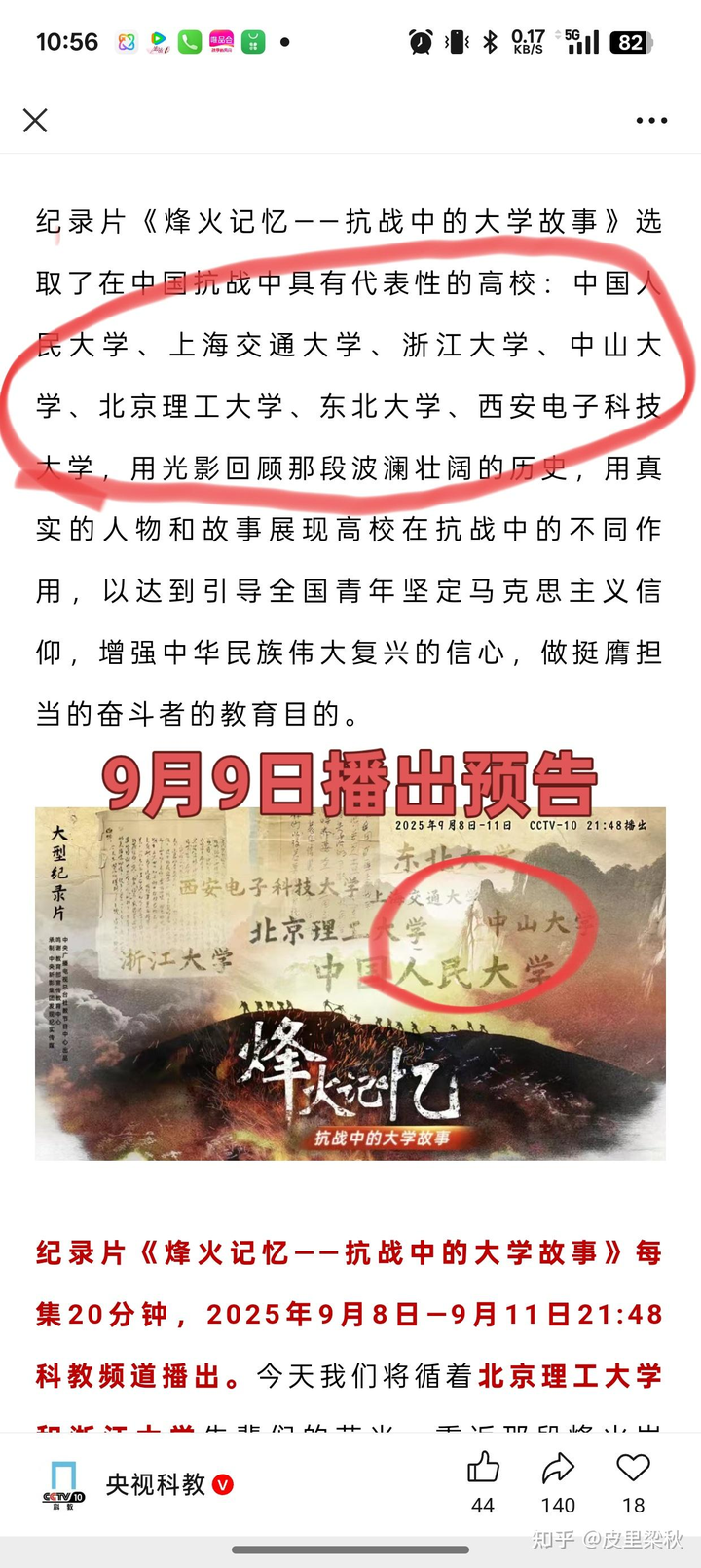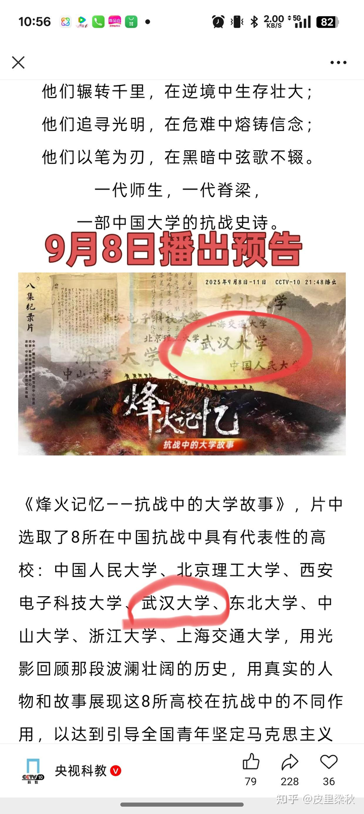 20、2025/9/9 央视原定八集的科教纪录片《烽火记忆——抗战中的大学故事》删去武汉大学单元集,变成了7集,本该一天两集的放映在原定武大上映那天只放映一集,网友怒气爆满、持续攻击中。
