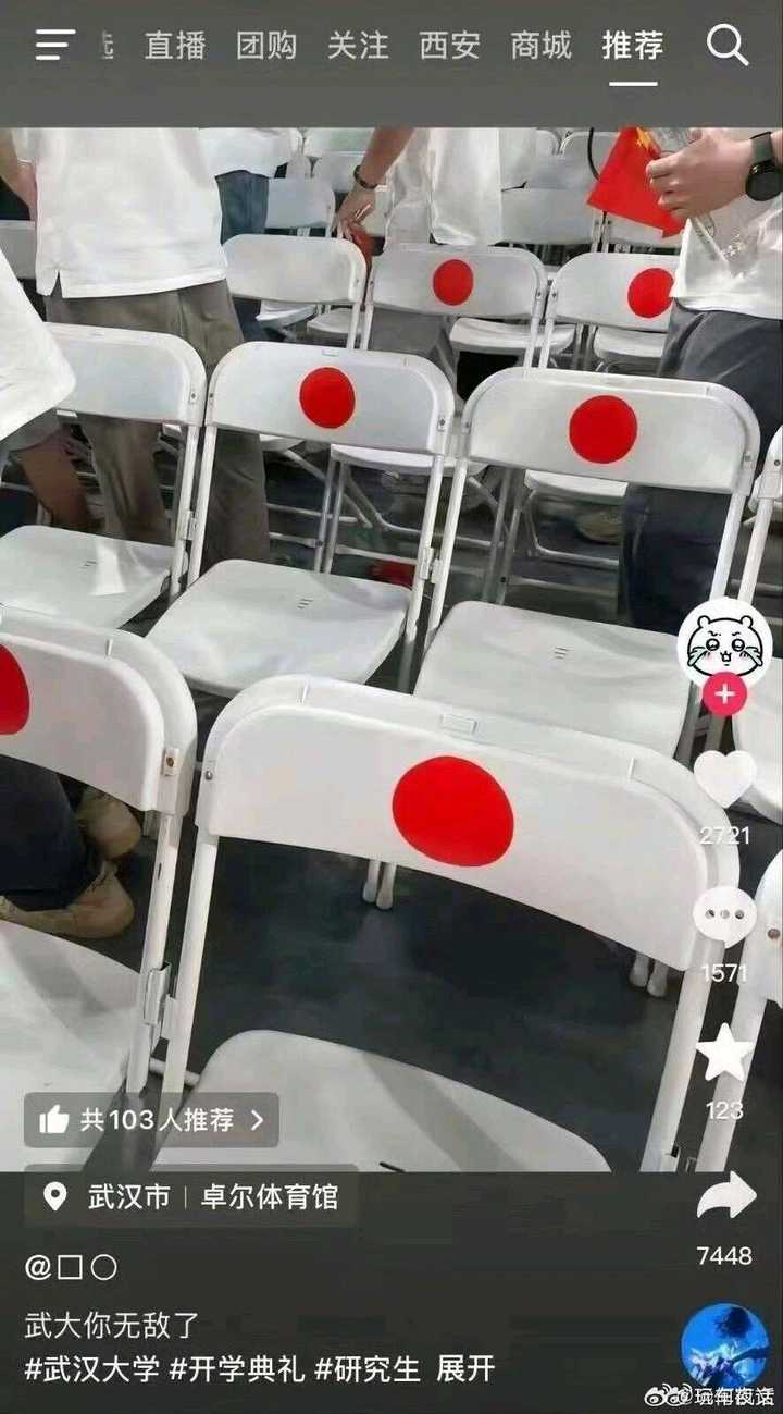 18、2025/9/5 九三阅兵两天后,武汉大学研究生开学典礼上,椅子呈现膏药旗图案。 同时,基于师生摄制视频,演奏《歌唱祖国》时全员坐着,而演奏武大校歌时全员起立,这本是件小事,但搭配膏药旗靠山与被随意丢弃的五星红旗,引发网友怒气+100,怒气爆槽要开大了.