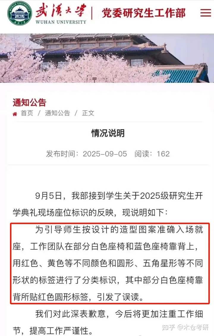 19、2025/9/5 武汉大学通报椅子图案问题,却连现场其他图案椅子的照片都没发(合理怀疑是因为数量极少且位置并不醒目,阴谋论怀疑就是根本没有),网友怒气满了持续攻击。