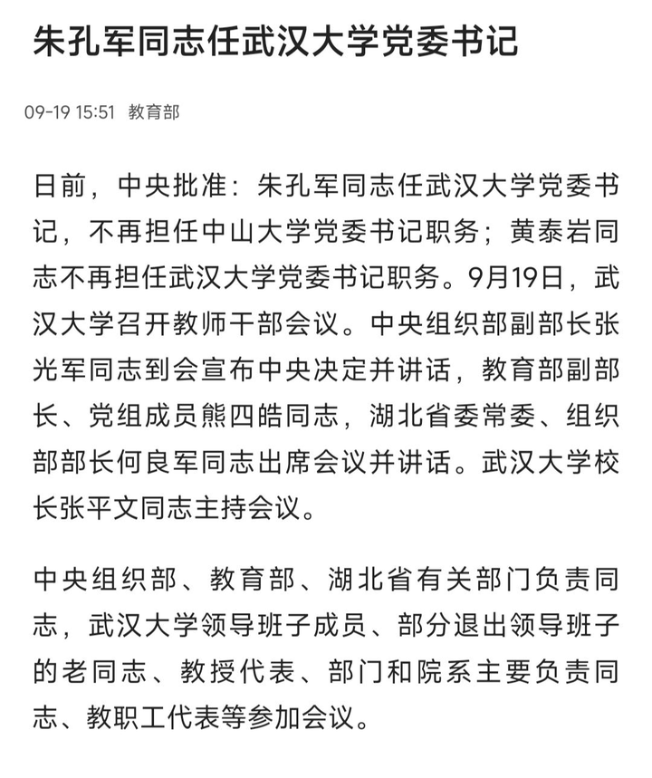 21、2025/9/19 武汉大学原党委书记、“永远的老校长”、在武大深耕前后近40年的黄泰岩免去武汉大学党委书记职务,中山大学原党委书记朱孔军同志任武汉大学党委书记,网友取得阶段性胜利。
