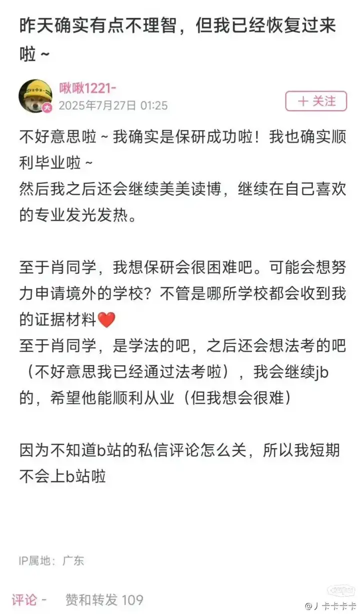 7、2025/7/27 杨景媛败诉后,在b站先后发表她和肖某某的人肉信息、以及自己尽管诬告败诉但仍会去香港浸会大学美美读博的动态,网友怒气值+1。