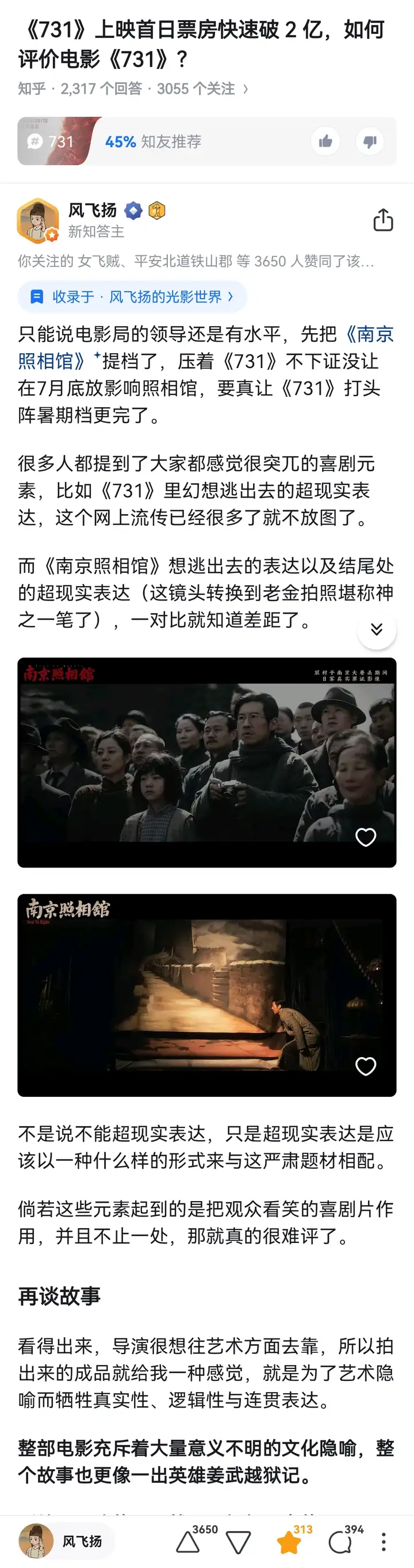 我知道,今天是个特殊的日子,我知道,《南京照相馆》珠玉在前,作为中国人,我们都想以自己的方式缅怀历史,但就像《流浪地球2》紧接着是《上海堡垒》,我们必须认识到,好片夹着烂片才是人类的常态,缅怀也不只有一种方式,更何况在电影《731》面前,《上海堡垒》我都愿意给他奥斯卡最佳影片。