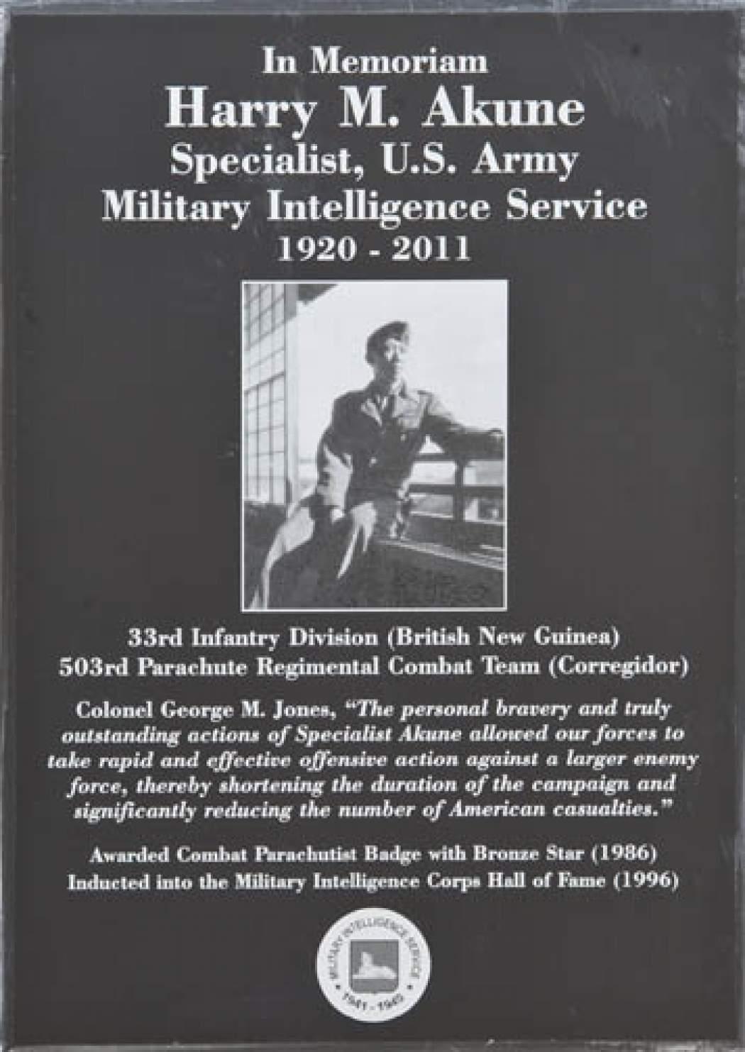 纪念碑上的事迹:最后终于审讯打开突破口,从其中一个俘虏处获得关键情报,极大帮助了海军登陆行动,被503团团长和多名队友写的联名推荐信强烈要求破格晋升为少尉。战时突破军官“玻璃天花板”的日裔美军屈指可数。