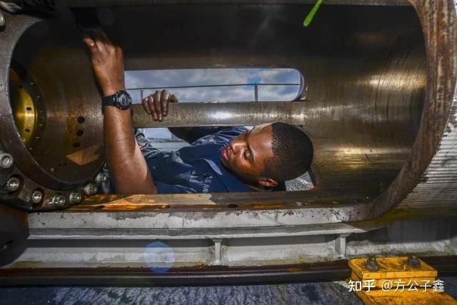 要有人钻到弹射器套筒内部进行清洁,50多米长的套筒,一天都无法完成,人钻进去以后,要在里面呆20-30小时,吃喝拉撒全在里面。