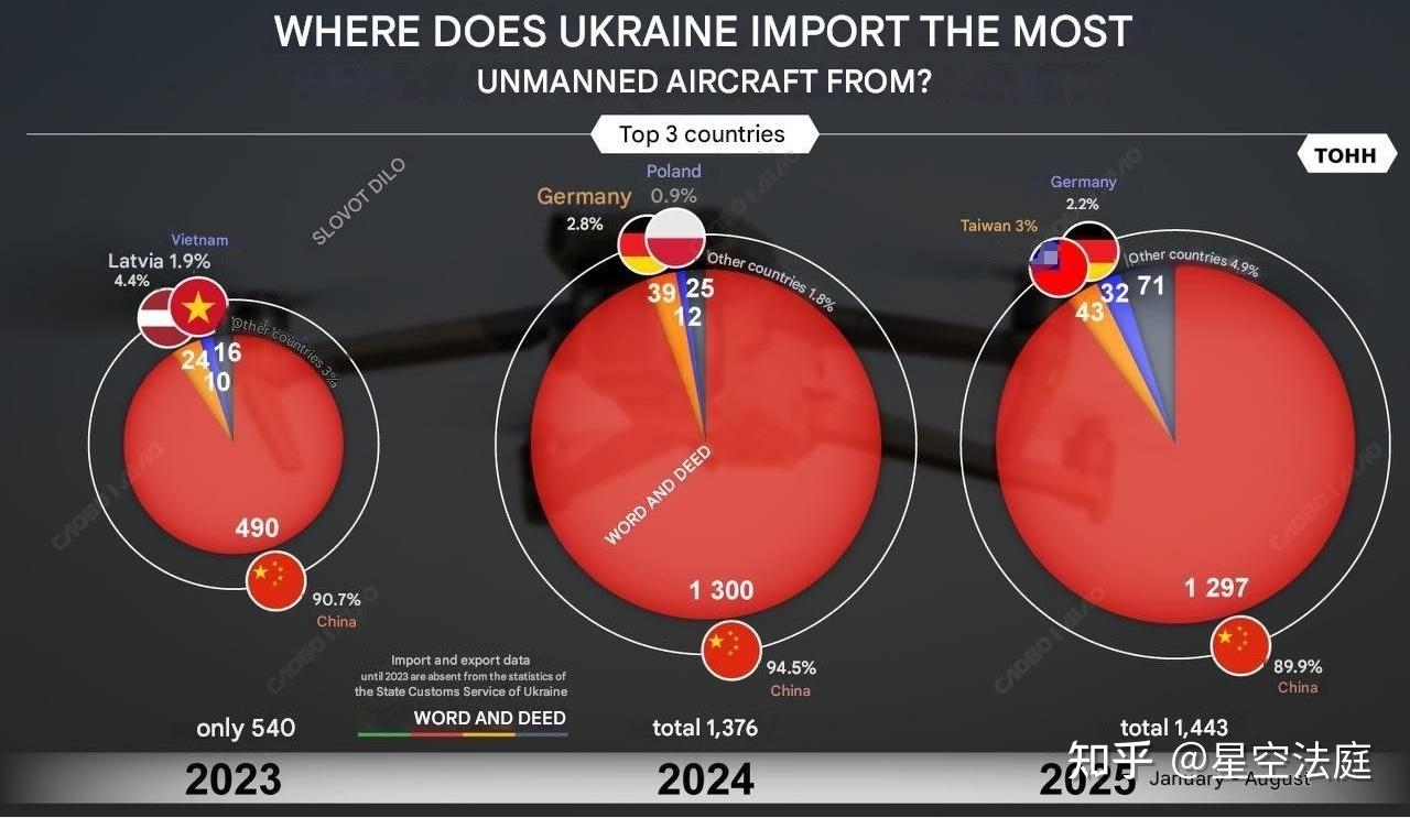 但乌克兰同样高度依赖中国供应链,乌克兰自己统计其无人机零件中90%都来自中国: