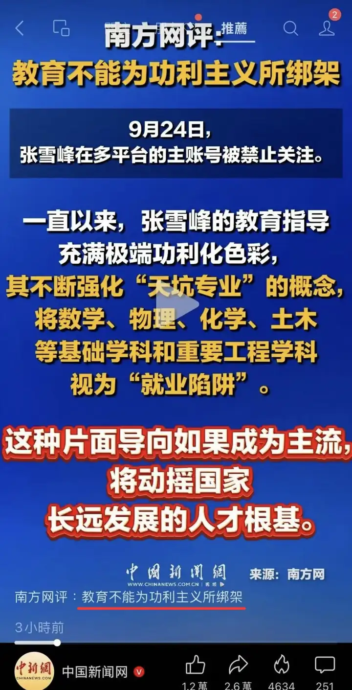 然而张雪峰得罪了新闻学也没有被禁止关注,得罪了难就业行业也没有被禁止关注,得罪了敌人却被禁止关注了,这就耐人寻味了。