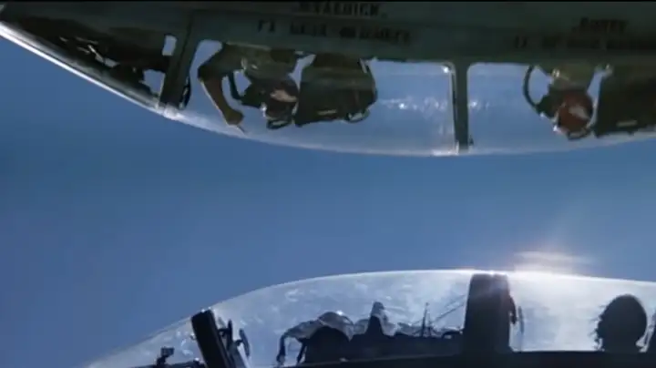 这个即视感实在是太强了,一眼壮志凌云 1986 里 F-14 独行侠倒扣 MIG28(F-5 饰)的这个镜头。
