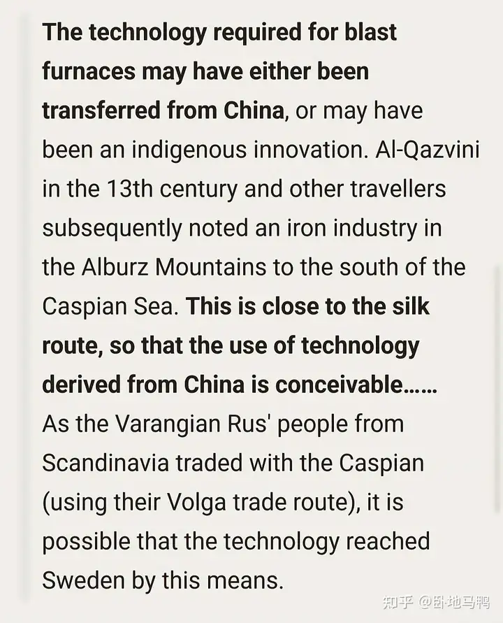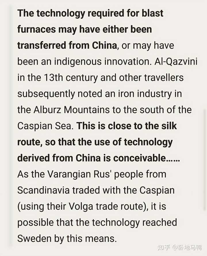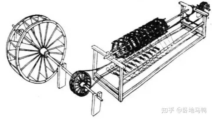 - 418 个点赞 👍已知古代中国创造的开创性技术有:世界最早的冶铁竖炉及高炉:竖炉出现并成熟于公元前4世纪(河南,西平冶铁遗址),高炉则出现于公元前2世纪(河南,古荥冶铁遗址)。 欧洲在公元12世纪才出现冶铁竖炉(1150,Lapphyttan),在公元14世纪才出现冶铁高炉(Blasofen),直至公元16世纪才将这一技术普及。在此之前欧洲只有极为原始的吹炼炉。 欧洲人认为这一发明正是由中国传入西亚,再从西亚经伏尔加商路传入欧洲:  顺带一提,这项发明也被认为是“第五大发明”的候选者之一。 世界最早的复杂织造机械:即公元前2世纪左右出现的提花机(四川,老官山汉墓),本体有84个综片,编织前先将一万多根丝线从综片的不同位置穿过,就能通过线制花本贮存提花程序 ,相当于预制绘图。 整件织物的花纹被区分为经线与纬线,用衢线牵引经丝,让两个方向的线按预设顺序排列,就可组合织出足足数百种复杂纹样。 正因如此,提花机的工作原理,被认为与二进制计算机的原理类似。而提花机也在此后的两千多年中不断迭代,演化出大量的改良版本,用于不同织物的织造。 而欧洲出现类似机械,要等到18世纪,由法国工匠贾卡(Joseph Marie Jacquard,1752-1834)创制,于19世纪进行改良,以蒸汽机械作为动力,变为自动提花机。这种机械也启发了二进制计算机的诞生。 汉代提花机复原图 世界最早的生铁冶铸技术:最早出现于公元前8世纪(山西,曲村-天马遗址),成熟于公元前6世纪(江苏,六合程桥遗址)。 欧洲直至公元14世纪,随着高炉的逐步普及,才掌握生铁冶铸技术。在此之前欧洲只能通过块炼法冶炼极为原始的海绵铁,通过锻打将其强化为熟铁。 世界最早的疫苗:即成熟于16世纪明代中期的人痘接种,分为旱苗法、水苗法等四大接种方式,是世界首个有效防控天花、采用人体特异性免疫疗法的疫苗。 直到1717年,英国驻土耳其公使夫人玛丽·蒙塔古将该技术引入欧洲,并于1796年启发了更为成熟的“牛痘接种术”(Edward Jenner),启发了现代疫苗的诞生。 世界最早的制动棘轮:最早出现于公元前6世纪(山西,侯马遗址),推测被用于战车的制动和滑轮传送机构,此后又出现了带有40个齿的铜棘轮和16个齿的铁棘轮。早于古希腊齿轮约300年。 世界最早的韧性铸铁冶炼技术:最早出现于公元前5世纪(湖北,铜绿山矿冶遗址),分为白心韧性铸铁和黑心韧性铸铁,用于加工农具和其他金属器物。 其中白心韧性铸铁在18世纪才被欧洲掌握(1722,http://R.A.F.de.Réaumur),黑心韧性铸铁更是直到公元19世纪才在美国出现(1826,S.Boyden) 世界最早的球墨铸铁技术:最早出现于公元前3世纪(河南,古荥冶铁遗址),强度极高,可与钢材相媲美,经由汉代退火工艺制成,每批汉代铸铁里大约有10%左右的材料会结出球状石墨。 而欧美正式开始运用球墨铸铁,则要等到20世纪左右。被用于加工齿轮,轴承等高强度材料,包括现代大马路上常见的一些井盖就是球墨铸铁制成的。 世界最早的生铁炼钢技术:即公元前5世纪出现的炒钢法(江苏,徐州楚王陵),通过快速搅拌液态生铁使其脱碳,从而生产熟铁或钢材,导致两汉时期钢铁兵器日益普及,成为当时全球冶炼技术断档第一的国家。 而在欧洲,这项技术在18世纪的工业革命时期才在英国出现,被称为“普德林法”(Puddling Process),与炒钢法原理一致。巴黎埃菲尔铁塔的结构材料正是采用该工艺生产而来的熟铁,欧美国家中亦有7万余公里的铁路材料采用该工艺制造而成。 世界最早的踏板式纺织机:即为公元前5世纪出现的斜织机,演化出全球最早的踏板结构,让织工可以手脚并用,一边用手控制经纬,一边用脚踩动多条踏板,联动控制综片升降,极大地解放了生产力,效率将近腰机纺织的数十倍。 而欧洲直到公元13世纪,才从西亚引进这种踏板卧式框架织机,在此之前,欧洲所用的纺织机械是一种极为原始的双轴织架,基本结构与我国新石器时代的腰机一致,效率奇低无比。该机械后续也启发了工业革命时期纺织机的基本结构。 汉代中轴式斜织机 世界最早的曲柄摇杆机械:即为公元前1世纪(东汉初期)出现的水排,也是世界上最早的水轮鼓风机,通过曲柄摇杆结构做功,将回转运动转变为连杆的往复运动,用水力驱动鼓风机械运转,单组水排每天可节省上百名劳工。 古籍中所绘的水排 世界最早的曲柄连杆机构:即公元前3世纪(西汉时期)出现的扇车,通过曲柄连杆手摇风扇,来清除谷物颗粒中的糠秕。类似结构在公元3世纪时才在希腊地区的Hierapolis锯木厂出现。 该结构在如今的各大机械发动机中仍旧是不可或缺的重要组件,也是内燃机的两大核心机构之一,在两次工业革命中都发挥了不可替代的作用。 古籍中所绘的扇车 世界最早的杠杆式投石机:起源于公元前5世纪,在《范蠡机法》中初见记载,在东汉时期得到曹操改进为加装轮子的“霹雳车”。 其在公元6世纪左右经阿瓦尔人传入欧洲,因其射速更快、载弹量更高等优势,在传入不久便迅速取代了当时欧洲使用的扭力弩炮,极大改变了战争格局。 世界最早的多管条播机:即公元前2世纪左右出现的“耧车”,在两汉时期面向民间大力推广。由畜力驱动前进,能同时完成开沟、播种、覆土三项工作,最多能同时播种五行耕地,大量节省了平民播种所需的劳力。 而同时期乃至十个世纪以后的欧洲,播种依然完全依赖人力,效率几乎不到耧车的十分之一,最先进的地方也仍停留在单管
