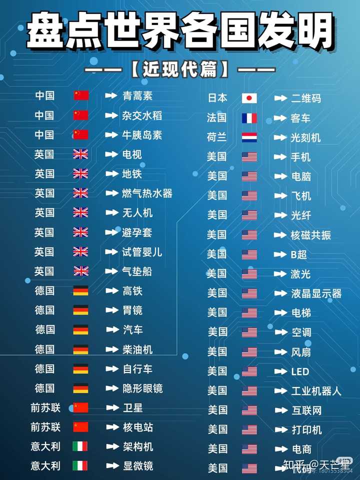 第一次工业革命是在唐宋明科技成果上的再突破,并不是西方人无中生有的。 怛罗斯之战,造纸术和指南针传入西方世界(含阿拉伯世界),并开启了阿拔斯王朝的百年翻译运动,这些成果陆陆续续传递到拜占庭帝国。 拜占庭帝国陷落后,开启了欧洲的文艺复兴,宗教改革和启蒙运动等三大思想解放运动。 此后在明末,利玛窦和汤若望等人,先后将大明科技成果和郑和下西洋的成果传入西方世界。 所谓利玛窦带来的《坤舆万国全图》,就是明朝人绘制的,这一点可以详细去看李兆良教授的著作《郑和环球测绘与科学治史》。 汤若望参与《崇祯历书》,成果来自1582年的格里高利历,而数据正是来自元朝总结自南北朝以来的天文成果。 如果西方人擅长0-1,为什么新中国建立后,西方0-1的成果越来越少?是人种退化了?还是制度禁锢? 反倒我们,结束清朝高文盲率以后,发明越来越多,新中国后不停的有新的突破。 西方近现代发明都是工业化后陆陆续续开始的,西方去工业化后,发明创造就戛然而止。 中国的近现代的发明都集中在2010年后,这是从中国开始完成工业化后陆陆续续出现的。 这也印证了我前面的观点:劳动实践才是发明创造的动力源泉。 还没有人送礼物,鼓励一下作者吧查看全文>> 天芒星