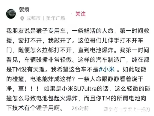 如何看待10月13日凌晨成都天府大道南段疑似小米su7超速车祸起火爆燃,疑似车门打不开人员死亡?