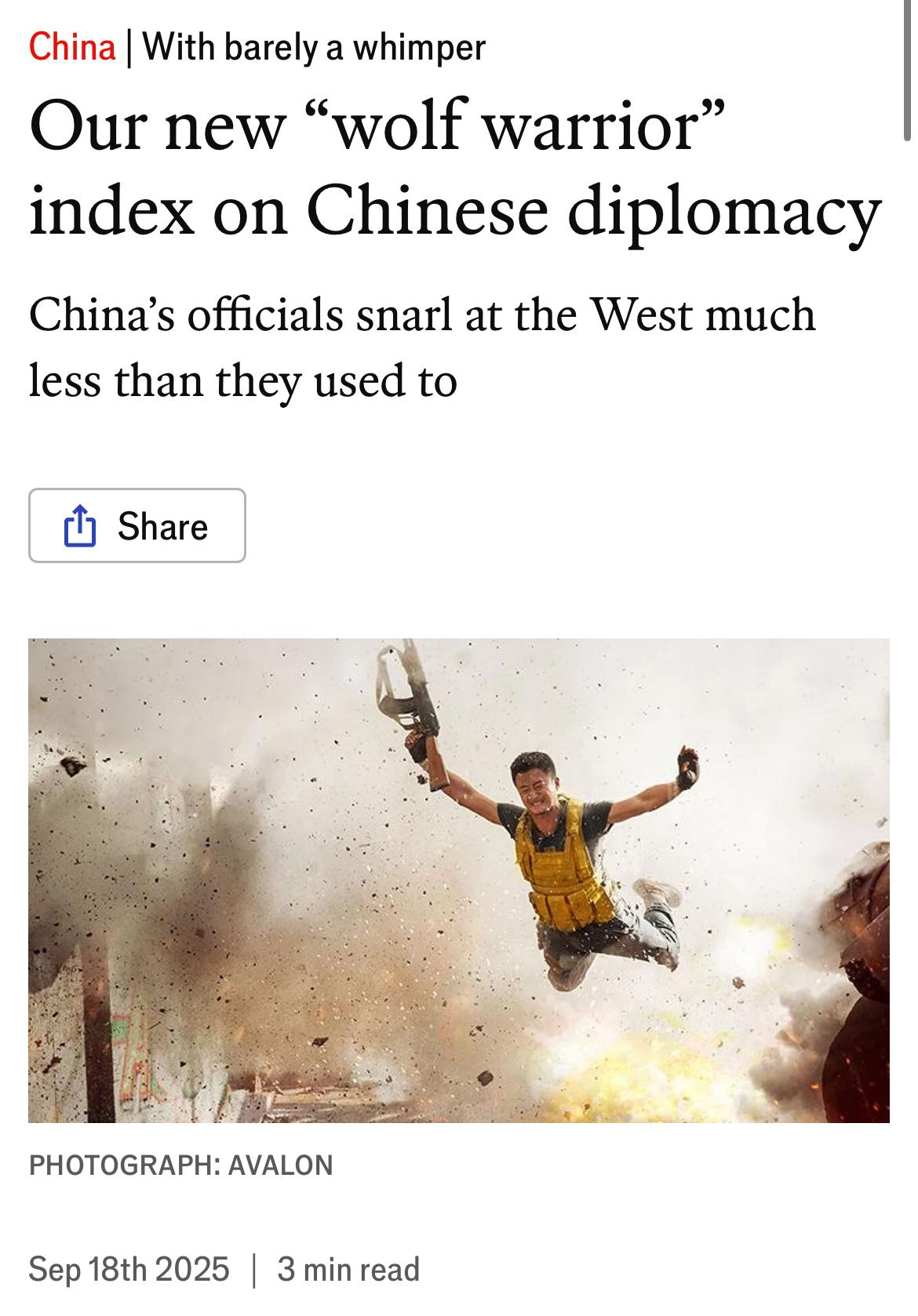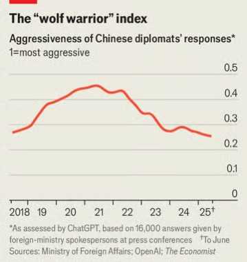 贝森特ping有点高,按照《经济学人》最近的研究,其实中国这几年的“战狼外交”(鹰派外交)的指数反而早就下滑了不少:
