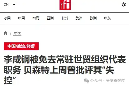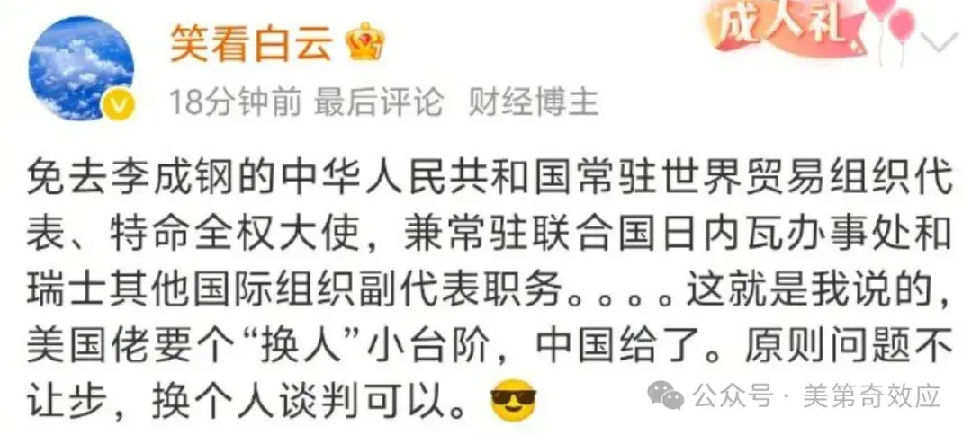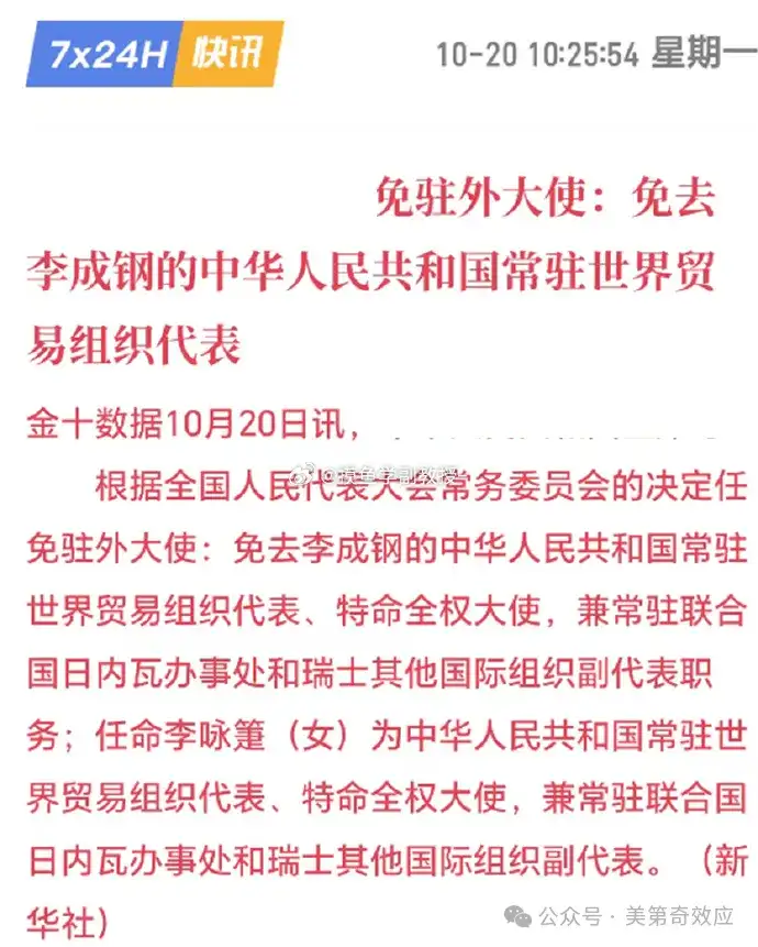 事实显然不是这样的。李成刚是25年4月份,从日内瓦常驻世界贸易组织代表(副部级)升任商务部国际贸易谈判代表(正部长级)兼副部长的,升任职级更高的新职位之后,免去老职位,是常规操作,否则李公也分身乏术。只不过因为驻外使节的任免要人大开会,所以才拖到现在走完流程而已。实际上,接替李成刚的李咏箑,原任国际贸易谈判副代表,今年7月免原职,9月就已经到世贸组织开始工作了。在贝森特被喷哭之前,9月29号已经向世贸总干事依维拉递交了任命书,摩擦升级之前,这事已经定了。