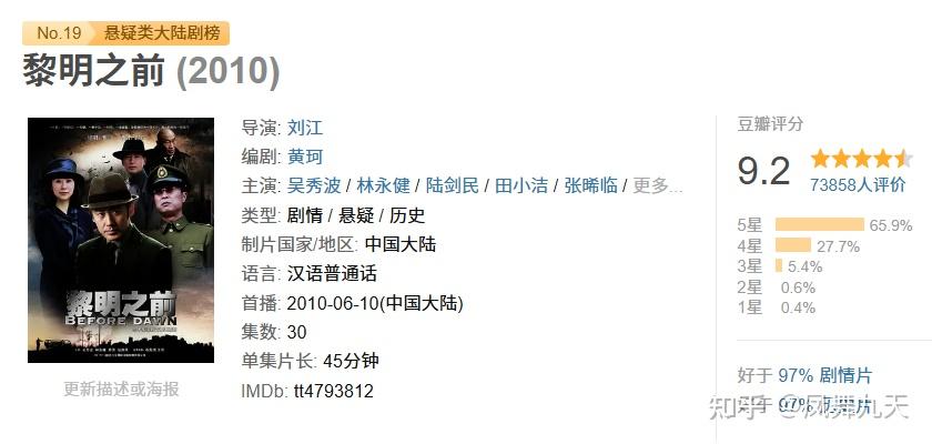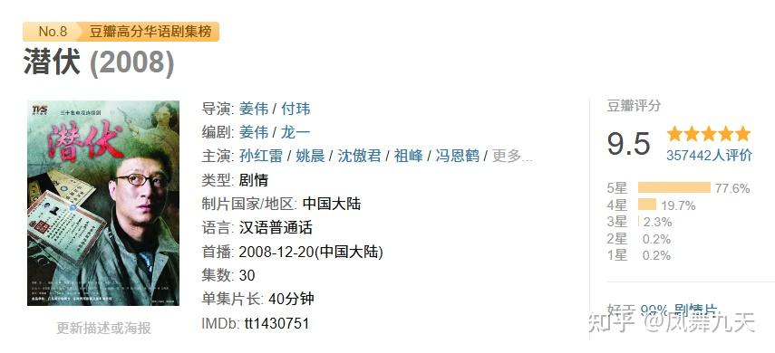 统共2万不到的评分人数,目前只有7.8分,跟同类作品《潜伏》(9.5)、《黎明之前》(9.2)、《悬崖》(8.4)等相比,实在差得有点多 —— 更何况很多人只是冲着题材和人物打出的感情分;
