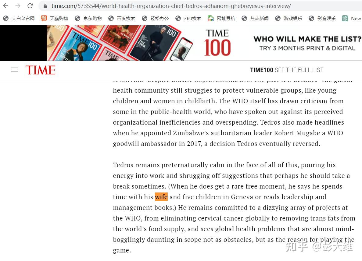 在19年末《time》的一篇访谈中,谭德塞说:当他有难得的空闲时间时,他会在日内瓦与妻子和五个孩子共度时光(原文网址:https://time.com/5735544/world-health-organization-chief-tedros-adhanom-ghebreyesus-interview/),其妻子的推特账号:http://t.cn/A6NtjKfQ