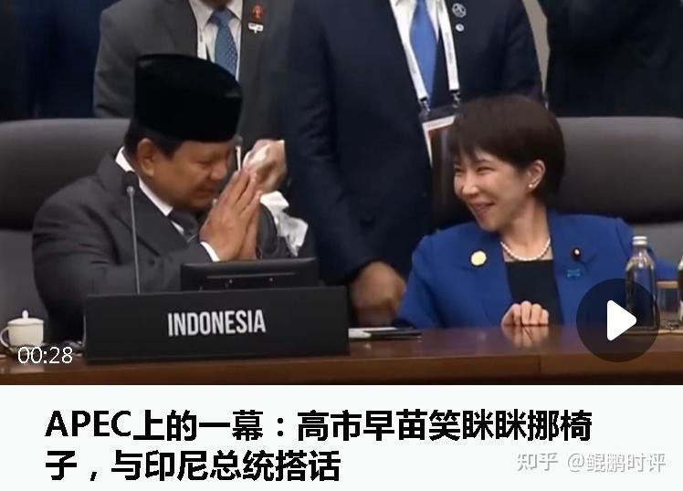 本来按照主办方安排,各国领导人的座位之间是有一定距离的。高市为了和印尼总统套近乎,先是眼睛偷瞄了一下,看有机会,然后双手扶着桌子边缘,利用了牛顿第三定律,双手向左使劲,于是桌子给了她一个向右的反作用力。
