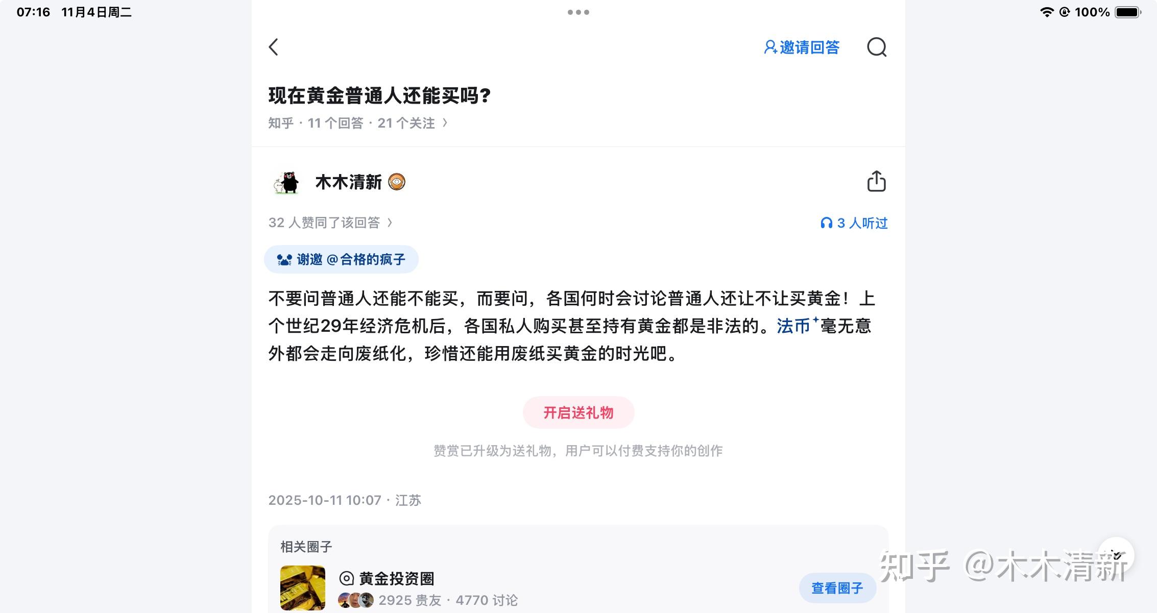 上个月的看法,看来这一天到来的比预想还要早。人永远守不住认知之外的钱,认知不到位,三代人的奋斗白费。前几年还在选择房产,现在还在天天纠结能不能买黄金的韭菜,未来会在第一波冲击下gg。 发布于 2025-11-04 07:21・江苏 赞同 58087 条评论分享 收藏喜欢