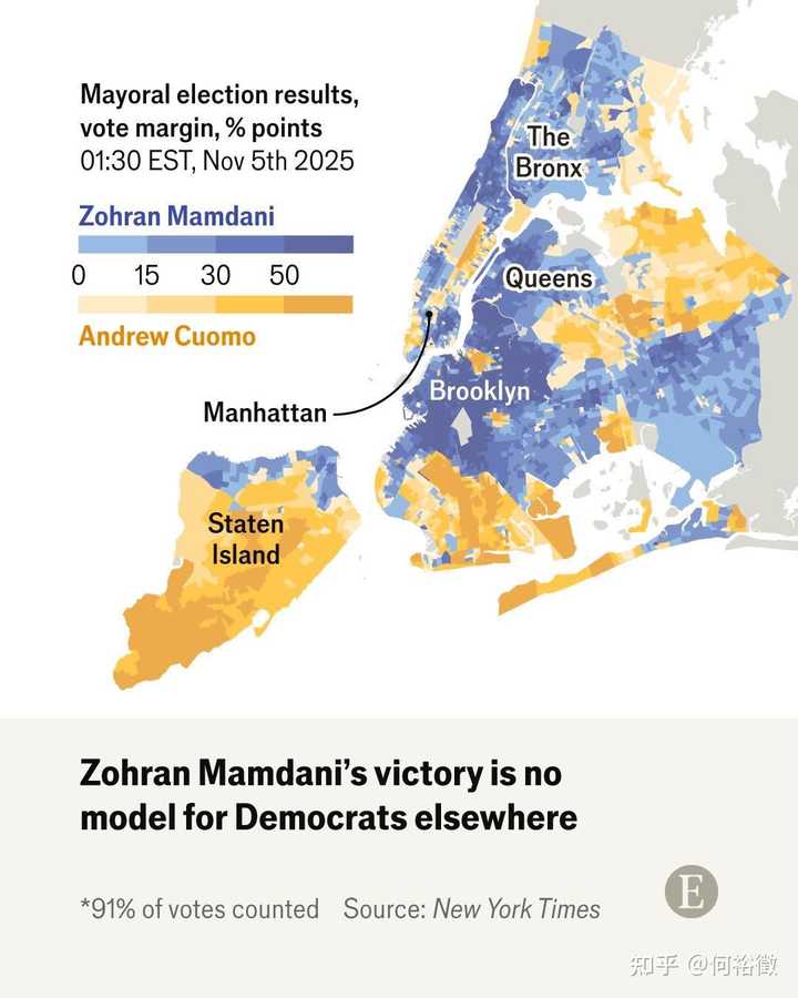 其一,马姆达尼具有多重身份背景。他集“90后”、乌干达与美国双重国籍、穆斯林、说唱歌手等标签于一身,多元身份背景使他成为纽约这座移民大都市的缩影。出口民调显示,马姆达尼赢得了白人、黑人、拉美裔和亚裔等多族群支持,穆斯林选民支持率近90%,民意基础极其稳固。