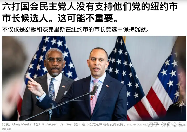 然而,建制派与中间派则担忧共和党利用“民主社会主义”的标签把民主党塑造为“激进左翼”,从而使民主党失去温和派与摇摆选民的支持,并在全国性选战中付出代价。同时,民主党内也有人提醒,应警惕华尔街资本撤离与犹太游说集团的反扑。参议院领袖舒默对马姆达尼的谨慎态度,以及现任纽约市市长亚当斯在选战中倒向科默,均将党内对马姆达尼的不信任暴露无遗。