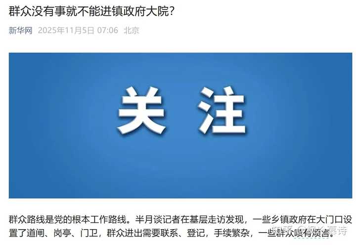 前两天我看到一个新闻,新华网发文:群众没有事就不能进镇政府大院?