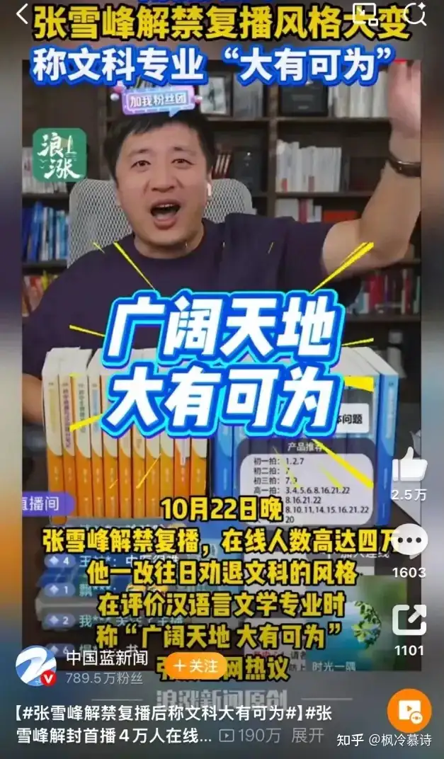 张雪峰的问题和他还不一样,张雪峰是过度宣传功利主义教育,主张选专业一切都要向钱看,这样做会导致我国学科教育资源失衡,但平心而论,这并不是张雪峰的本意,因为他只是根据就业的实际情况给出了自己的个人建议而已,你可以说他的言论极端,但不可否认,他说的很多都是客观事实,所以对张雪峰的处理是封号一段时间,让他纠正自己的言论,改过自新这件事就可以翻篇了。