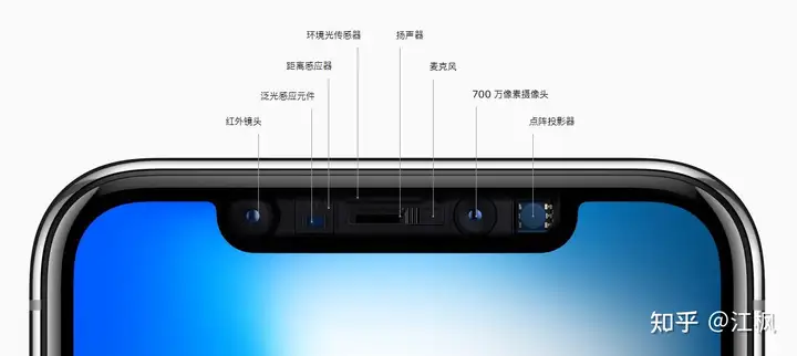 果子从 2017 年的 iPhone X 开始采用刘海屏设计,在这个刘海里有〔红外镜头、泛光感应元件、距离感应器、环境光传感器、扬声器、麦克风、700万像素摄像头、点阵投影器〕,主要就是这 8 个元器件。