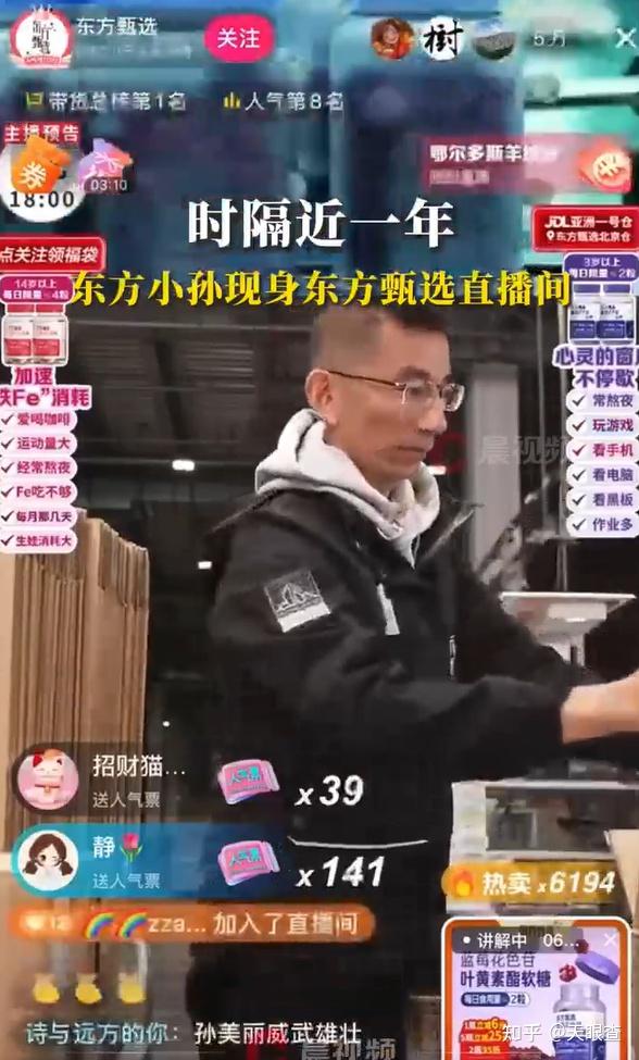 2024年11月25日,时隔近一年,孙东旭重回直播间。直播间里,他与东方甄选主播天权一起打包仓库货物,孙东旭还笑称,许久未播,业务有些生疏了。