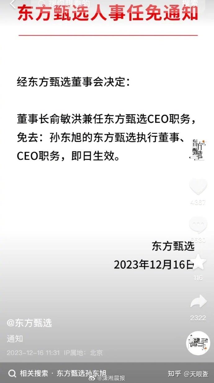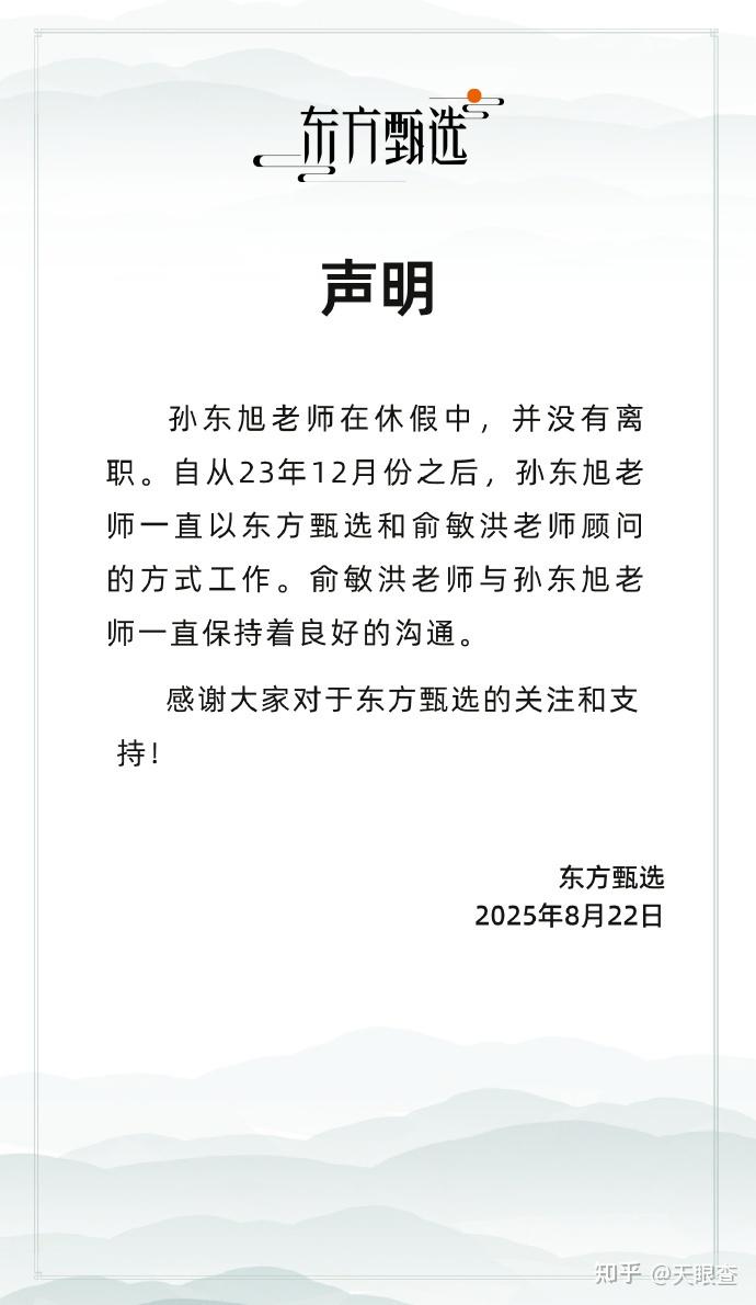2025年8月22日,有消息称前东方甄选CEO孙东旭目前已经进入休假状态,可能将在近期离职。