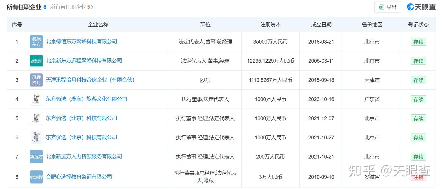 据南方日报,知情人士表示,孙东旭每年夏天都会休假陪伴家人,今年只是照例休假。目前其没有任何离职计划,休假结束后将正常返岗。目前,天眼查官网显示,孙东旭名下关联8家企业,其中7家为存续状态,包括【东方甄选(北京)科技有限公司】、【东方优选(北京)科技有限公司】、【北京新东方迅程网络科技有限公司】等。孙东旭在上述公司中担任法定代表人、执行董事、总经理等职务。