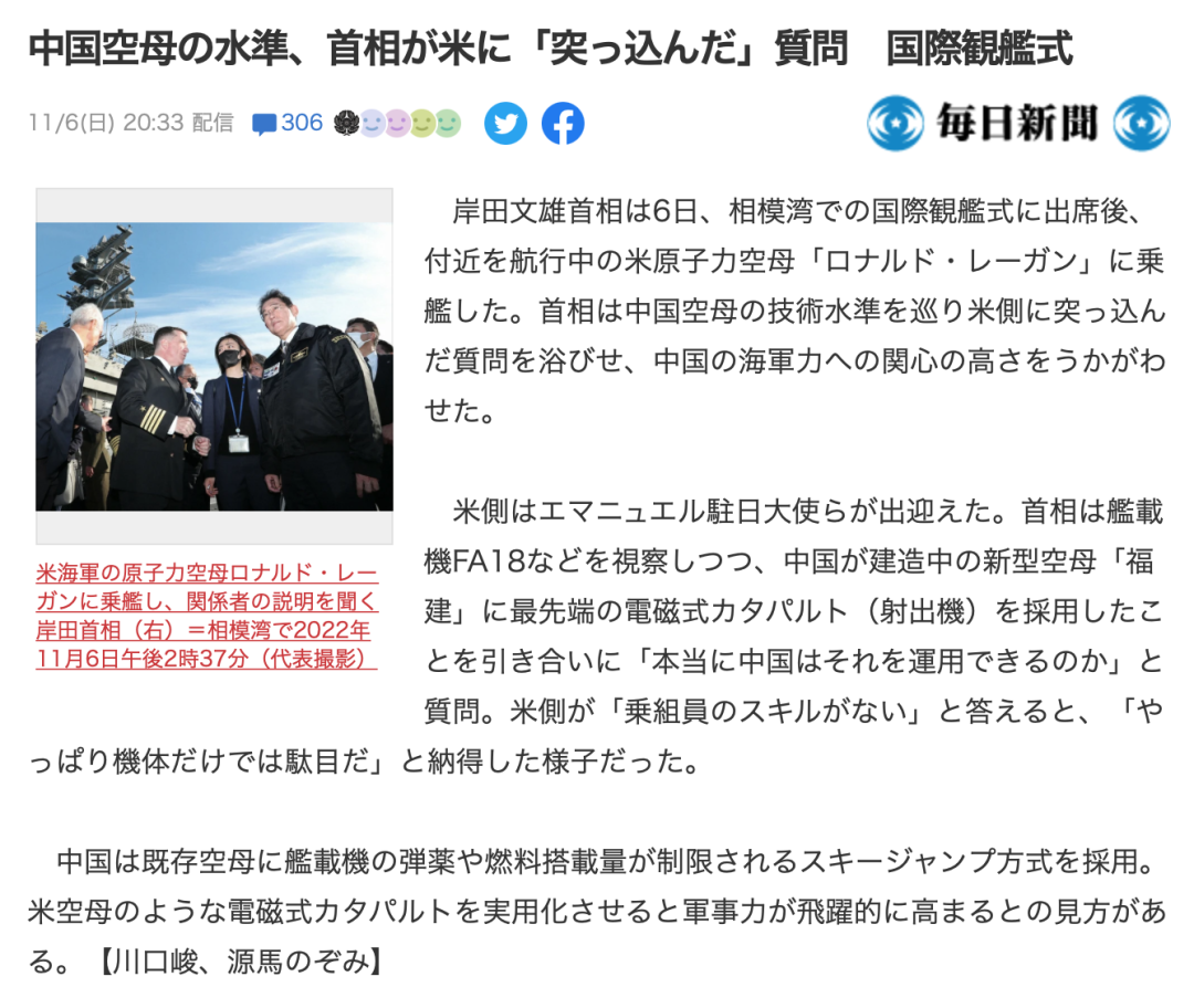 2022年,岸田文雄一行参观F/A-18舰载战斗机时,岸田文雄提到了中国目前正在建造的新型航空母舰“福建舰”使用最先进的电磁弹射器一事,并向美方提问称,“中国是否真的能操作这种电磁弹射”。当美方回答“操作人员缺乏技能”时,岸田表示“果然只有机体本身是不够的”,并表现出了满意的样子。