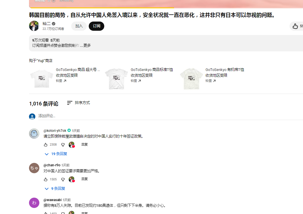 这个博主我知道,以前刷到过他的视频,是个韩国人,观众日本人居多,扫过一眼他的主页,内容包括不限于:"中韩慰安妇不存在,韩国慰安妇雕像煽动仇恨,南京大屠杀不存在,日本地上天国"吧啦吧啦,典中典。昨天又去搜了一遍,油管视频全没了