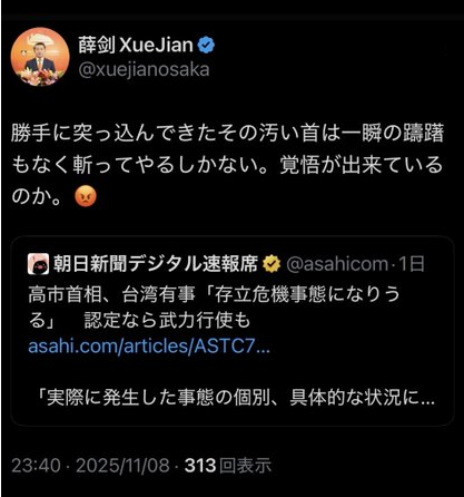 那条发言疑似被X平台给删了,我也看了下图,从机翻的上下文联系来看,驻大阪总领事的意思是:“擅自干涉闯入者,必将毫不犹豫斩下其肮脏首级,做好觉悟吧。”