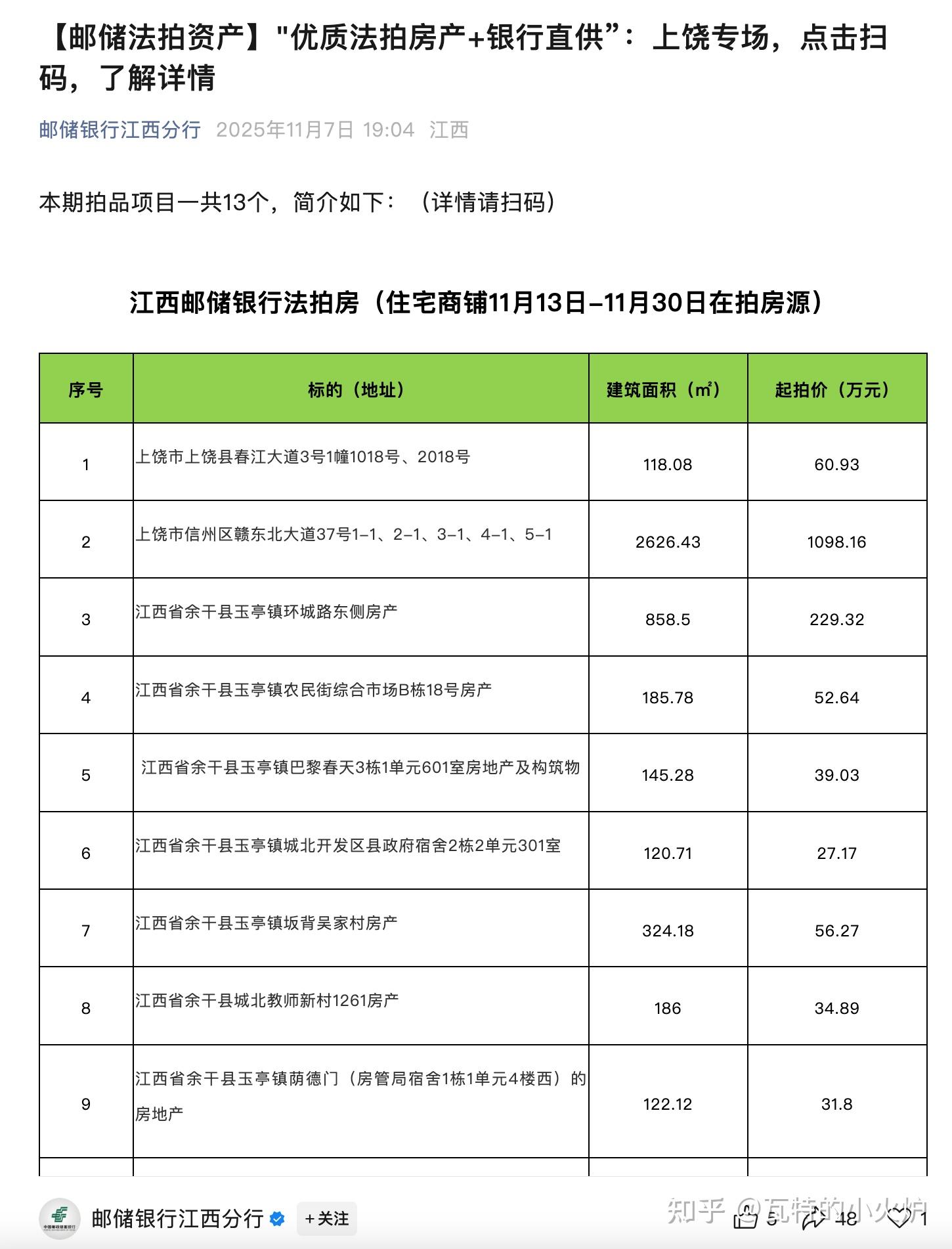 邮储银行江西分行近期在公众号发布多篇“法拍房产+银行直供”推广信息,涉及南昌、抚州、赣州等地。