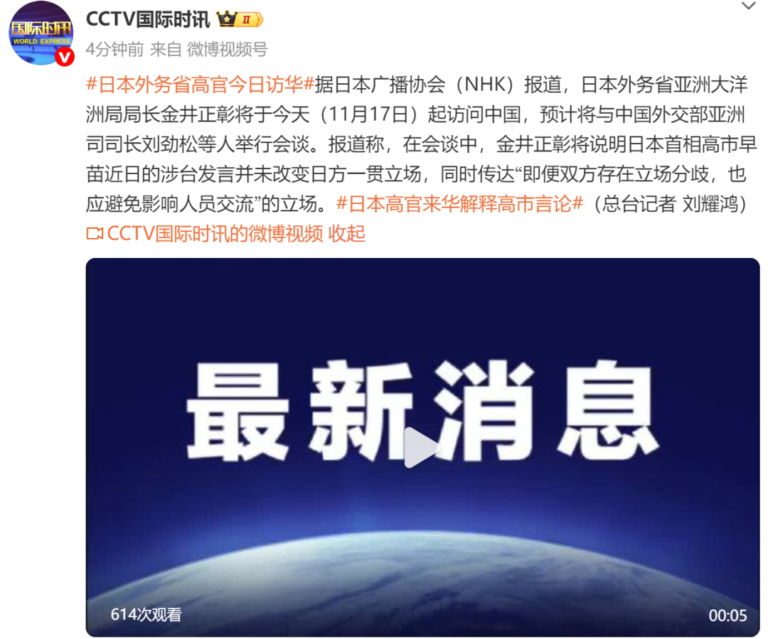 11月17日,日本外务省高管匆匆忙忙访华,解释高市早苗的言论……
