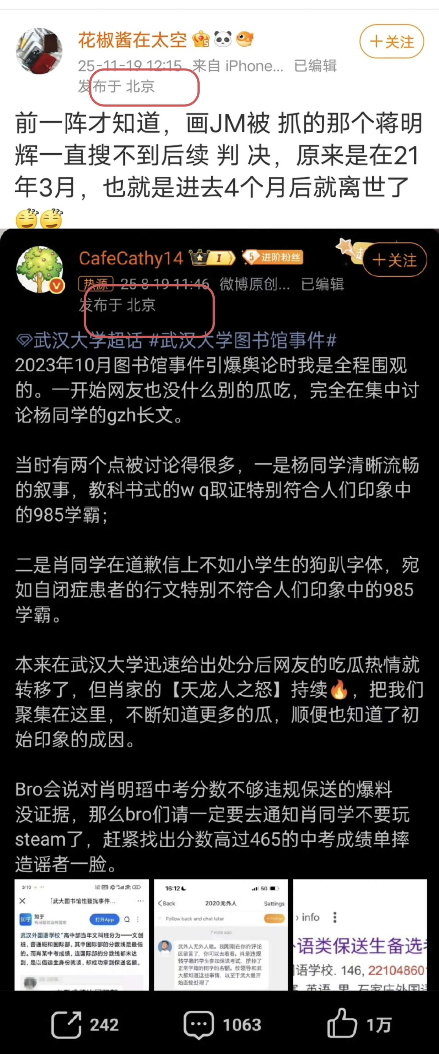 从肖同学所谓搜集二战德国勋章,到高中厕所转笔的虚构模因传播,再到肖同学武大校园飙车等不实指控。这些谣言的源头,几乎都绕不开这位CafeCathy14,也就是花椒酱在太空的精心炮制、推波助澜。